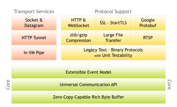 Netty의 기본 구조 이다. 코어 부분을 보면 이벤트 모델을 가지고 있고 쉽게 사용이 가능하도록 해주는 API 를 제공 하고있으며 zero copy capable rich bytebuffer 라는것을 지원하는데 이 특징으로 인해서 GC 를 최소화 하여 고성능을 보장하게 된다. Netty는 비동기식으로 작동하기때문에 적은 스레드로도 많은 요청 처리 가능하여 서버 자원을 효율적으로 사용이 가능하다.