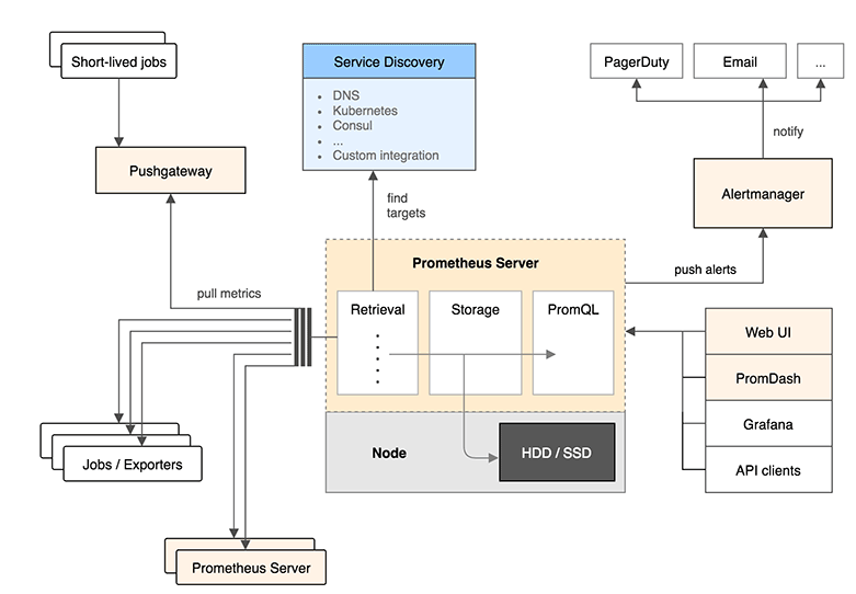 위 그림이 가장 구조를 잘 보여주는 그림인거 같다. 프로메테우스는 단일 서비스로 모든것을 처리하는것이 아니라, 데이터구독을 위한 클라이언트( Expoter) 가 있고 특정기준 발생시 알람을 발생시켜주는 AlertManager 가 있다. 그리고 기본적으로 Web UI 를 제공하여 간단한 서버 상태나 그래프를 볼수 있다.