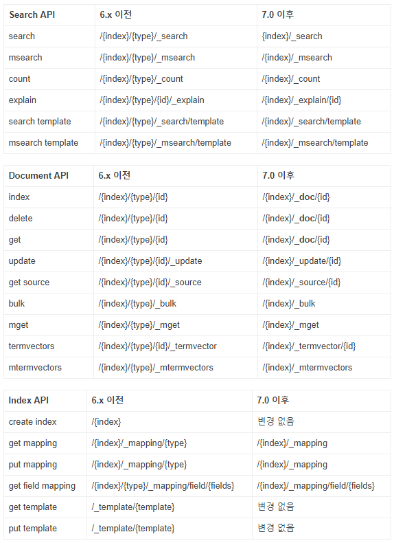 참조 링크에서 api 부분만 따로 캡쳐 대부분의 ELK API 사용에 관련된 내용을 검색하면 API 사용시 TYPE 을 명시하게 되있다. 그래서 그부분이 삭제 되면서 혼란이 가중됬고 그럼 어떻게 사용 하는지 다시 찾아볼 필요가 생겼다. DocumentAPI 경우 type에 들어가던 부분을 지정자 _doc 로 대치 하면 대부분 적용된다고 한다. ( 테스트가 필요할거 같다 ) 예를 들면