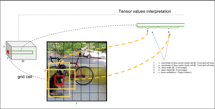 siglenetwork 를 사용하기 때문에 속도적으로 아주 빠른 연산이 가능하고 기존 속도를 우선시했던 방식들에 비해 성능적으로 우수한 편에 속한다. 기존적인 디텍션 방식을 보면 7x7 output 을 사용하고 class 에 맞게 일정 범위의 차원을 설정한뒤 그 가운데에 한점을 기준으로 두개의 박스를 설정한다.