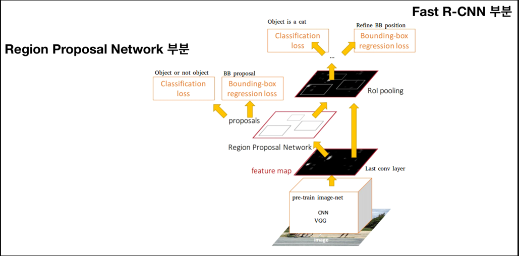 - 512 필터 사용 -> 박스 영역 계산/ 오브젝트 존재 유무 계산-> 회귀 / 분류를 함. -> 박스 크기를 보정 ( 풀링 ) -> 박스와 클래스를 fc 레이어로 전달 -> 박스 좌표와 클래스 정보 검출