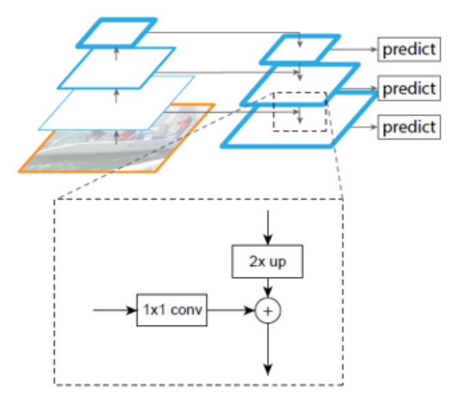 Top-Down :많은 의미 정보들을 가지고 있는 특징 맵을 2배로 업샘플링(Up-sampling) 하여 더 높은 해상도의 이미지를 만들수 있음.