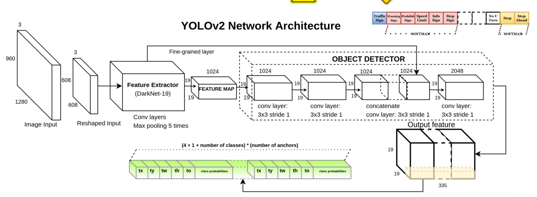 Yolo v2 때만 해도 속도는 괜찮았지만 성능은 조금 아쉬웠던거 같다. 하지만 다크넷이 등장하면서 yolo 의 인기가 비약적으로 늘어난거 같다. 다크넷은 일반적인 오브젝트들에 대하여 사전 트레이닝이 되있는 네트워크이다. 그리고 앵커박스 자체를 사전에 미리 제작해서 사용하며 5개의 다른모약의 앵커박스를 대표적인 이미지 기준으로 생성 한다. 그리고이미지 처리를 하는 과정에서 결과를 계속 누적시켜 처리하여 정확성을 높이는 방식을 사용한다. output 도 기존 7x7 에서 13x13로 크기도 증가하였다.