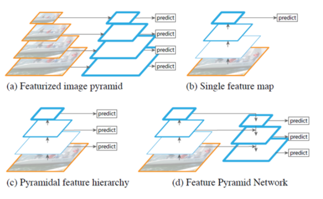 여기서 잠깐 말했던 FPN 이 뭔지 기록하고 넘어 가야할거 같다. Object Detecion 시 Scale-Invariant 를 중요시 여겼다고 한다. 다양한 물체를 탐지하기 위해서 이미지 자체의 크기를 리사이즈 하면서 찾았다고하는데 대신 메모리나 시간 측면에서 문제가 생길수 밖에 없었다. 그래서 나온 여러가지 방식이 있는데 이해하기 쉬운 그림이 있어 첨부 한다.