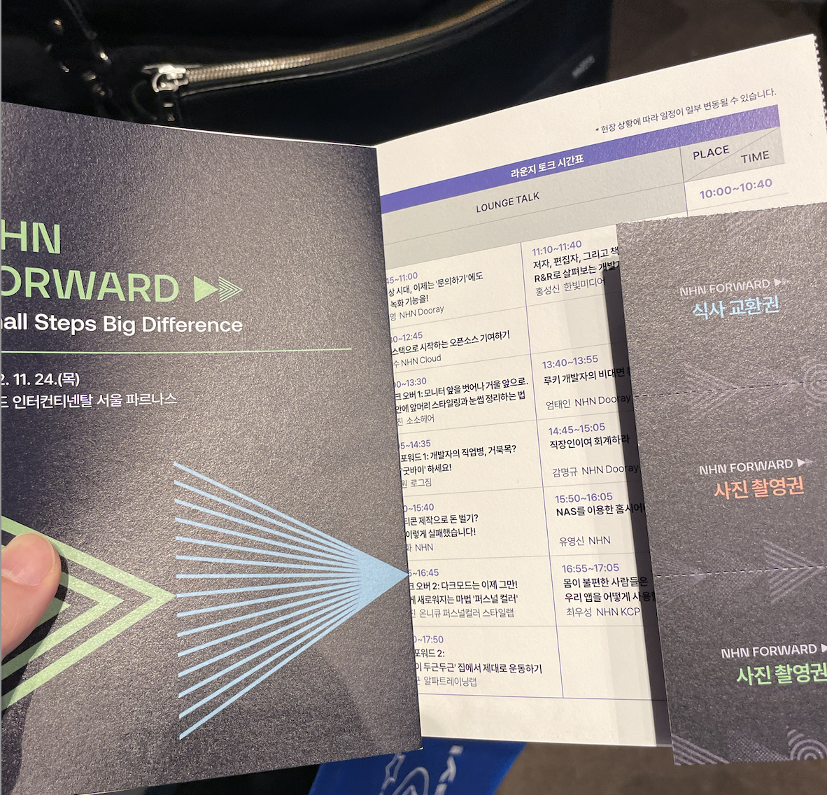 사진의 검은 안내책자도 확실히 업그레이드돼있었다. 펼쳐보면 굿즈 쿠폰들과 식사권이 붙어 있었고 어떻게 보면 배보다 배꼽이 클 수 있겠지만 QR 코드가 도입됐다면 차라리 전부 QR로 했으면 어땠을까? 하는 생각도 들었다. NHN이라면 그 정도쯤이야...라는 생각이 ㅎㅎ